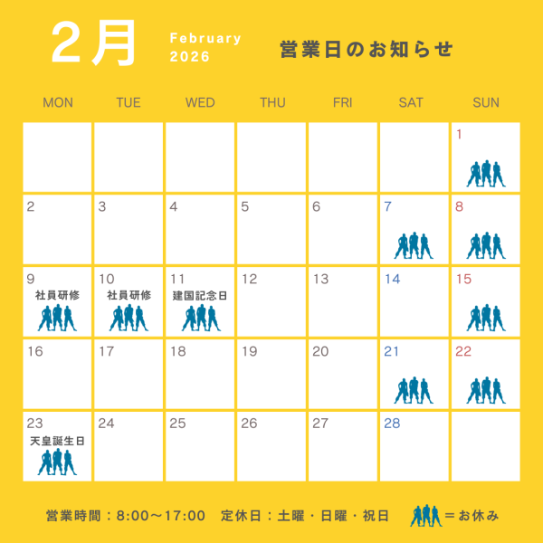 2026.01 29 お知らせ 2月営業日カレンダー ホームページをご覧いただきありがとうございます。2月の営業日は下記の通りです。 お問合せはこちら お問い合わせ ← お知らせ 関連ニュース 2022.06 30 お知らせ 7月営業日カレンダー 2024.08 26 お知らせ 9月営業日カレンダー 2025.11 26 お知らせ 12月営業日カレンダー