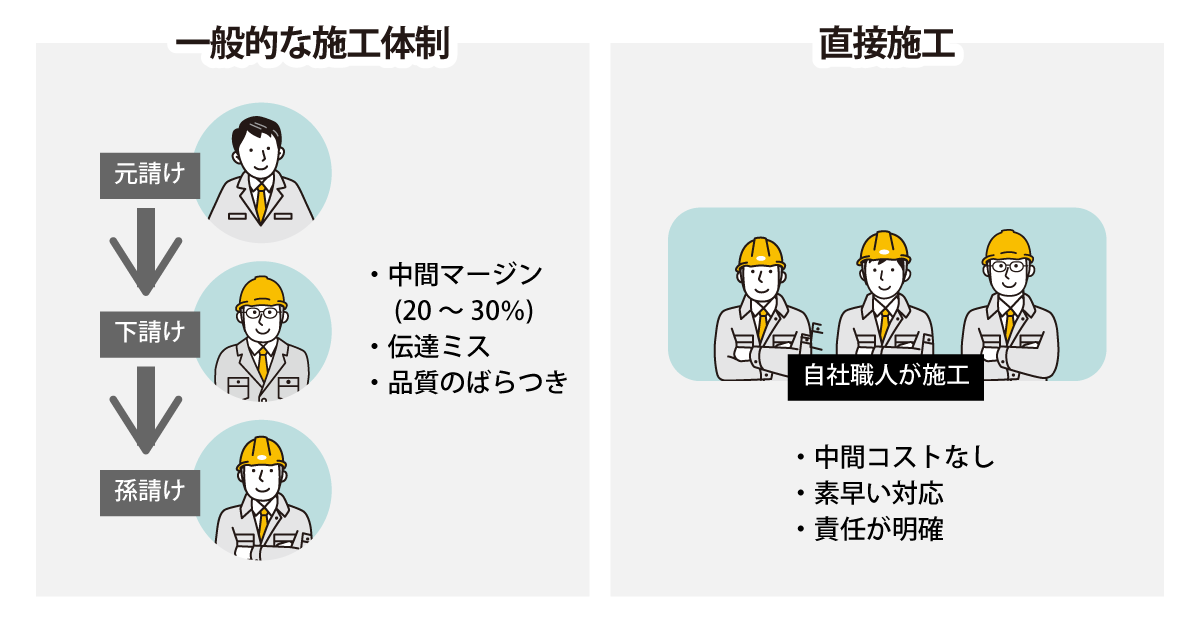 一般的な建設工事では元請け・下請けといった多層構造により中間コスト(20〜30%程度)が発生する場合があります。さらにこの構造では、情報伝達のズレや施工品質のばらつきが生じるリスクもあります。
