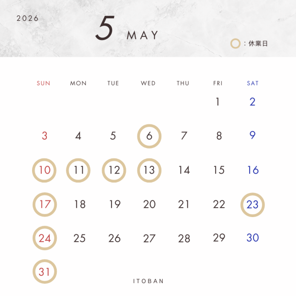 2026.04 27 お知らせ 5月営業日カレンダー ホームページをご覧いただきありがとうございます。5月の営業日は下記の通りです。 お問合せはこちら お問い合わせ ← お知らせ 関連ニュース 2020.05 15 お知らせ 臨時休業のお知らせ 2022.06 30 お知らせ 7月営業日カレンダー 2022.05 31 お知らせ 6月営業日カレンダー